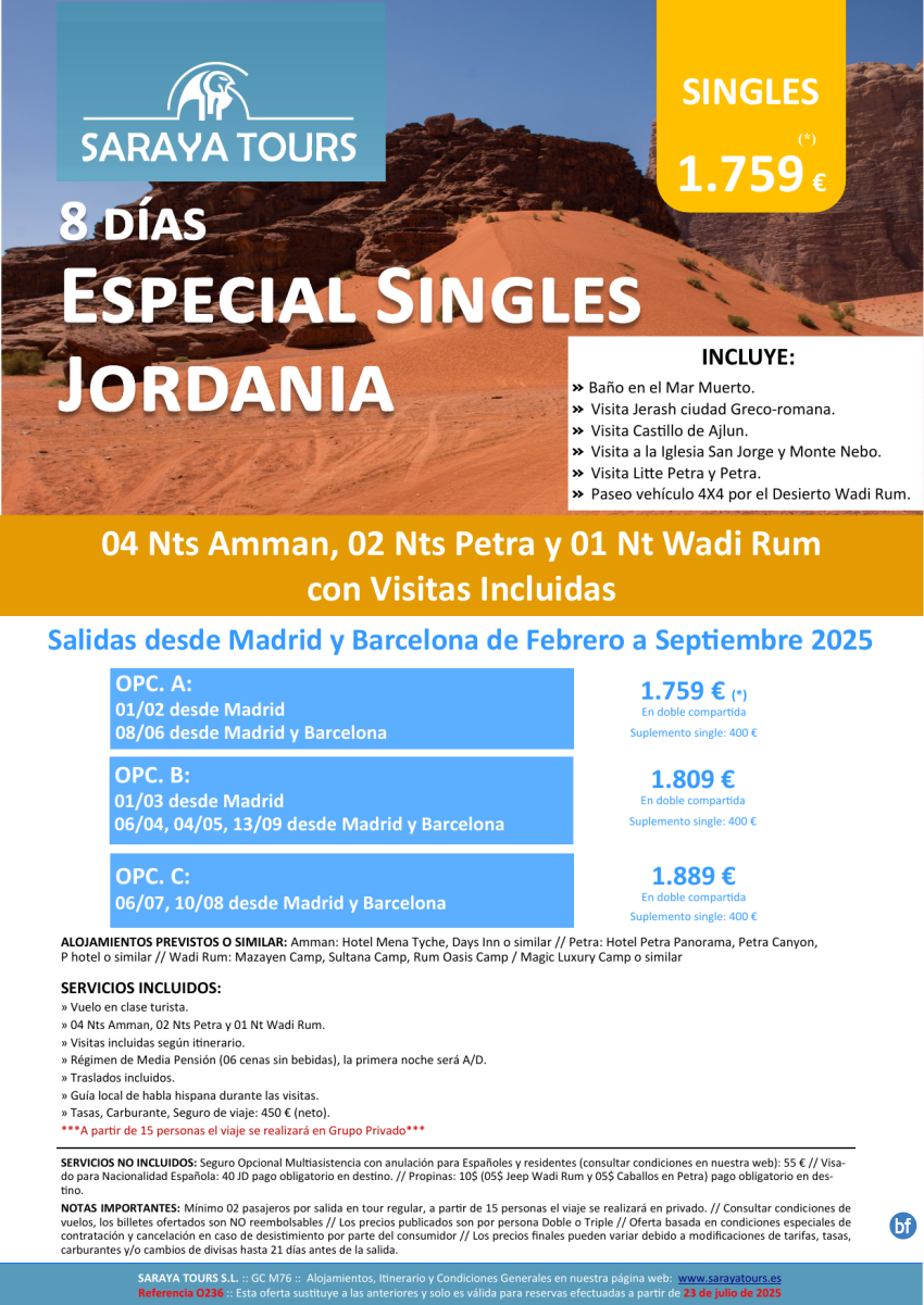 Especial Singles a Jordania 8 días! Circuito con Visitas Incluidas: Ammán, Petra, Wadi Rum hasta Febrero 26