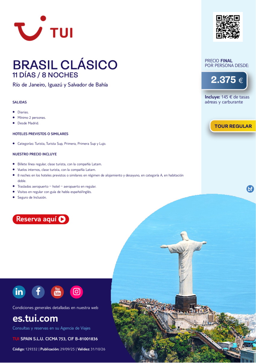 Brasil Clásico. 11 días / 8 noches. Tour Regular. Salidas diarias desde MAD desde 2.375 €