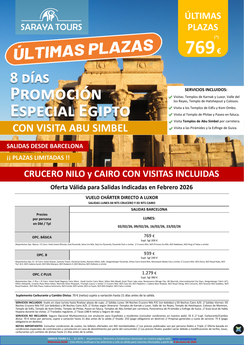 Últimas Plazas Promo Egipto con Abu Simbel 8 días. Vuelo chárter desde BCN. Crucero y Cairo con Visitas.