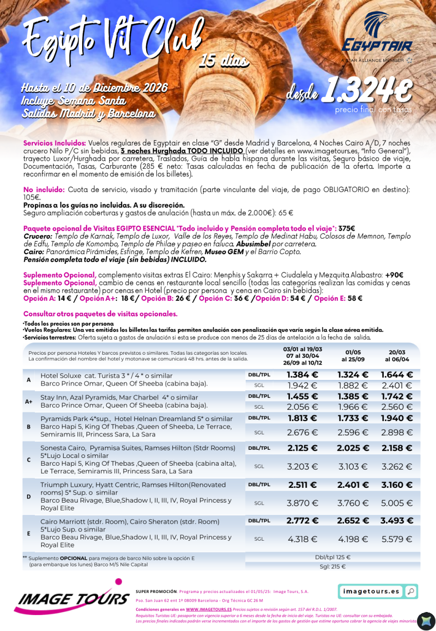 VIT Club hasta diciembre 2026, 15 días de viaje a Egipto desde 1.324€